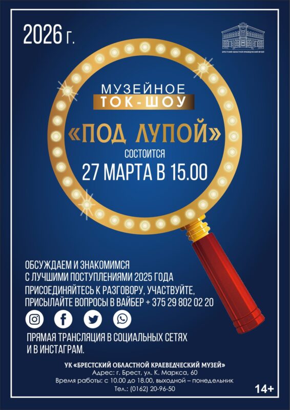 27 марта в 15.00 в Брестском областном краеведческом музее состоится шестое мероприятие ежегодного проекта “Музейное ток-шоу “Под лупой”. В ходе ток-шоу зрителям будут представлены самые интересные предметы, из последних поступлений. Сотрудники музея вместе с авторитетными экспертами помогут понять и оценить каждый из них. Все желающие смогут принять участие в дебатах и выборе предмета, который будет объявлен “Поступлением года”. Голосование продлится в течение 3-х дней с 27.03 по 29.03 в соцсетях Facebook, Instagram, ВКонтакте, Телеграм.
