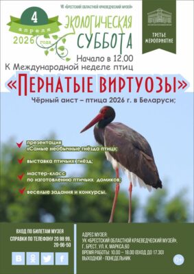 В течение апреля в музее будут проходить экологические игры для школьников, экскурсии «В мире птиц». Любой желающий может поучаствовать в конкурсе «Стихотворение о птице года» (собственного сочинения), в 2026 г птицей года Беларуси объявлен аист чёрный.