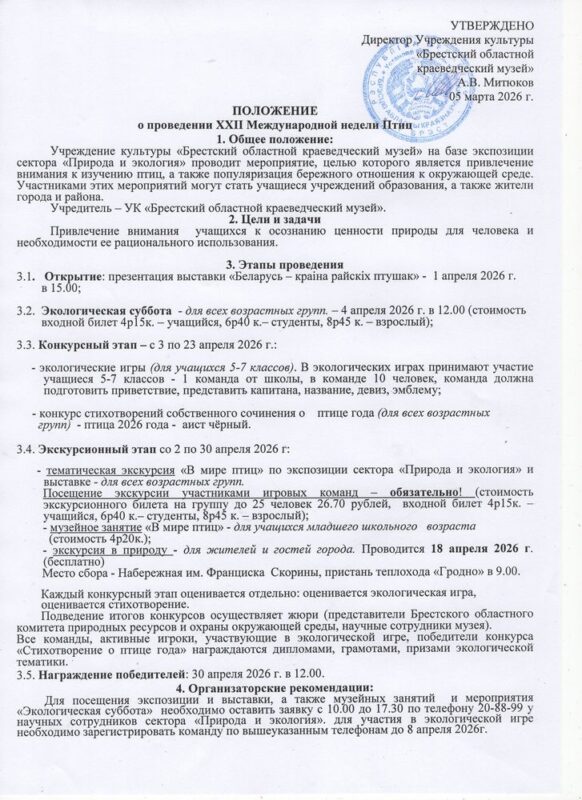С 1 по 30 апреля 2026 г. УК «Брестский областной краеведческий музей» приглашает принять участие в мероприятиях, посвящённых Международной неделе птиц.
